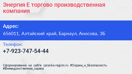 Энергия-Е, торгово-производственная компания по адресу 656011, Алтайский край, Барнаул, Аносова, 3Б в дальнейшем Организация, размещена в следующих категориях: