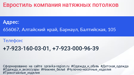 Евростиль, компания натяжных потолков по адресу 656067, Алтайский край, Барнаул, Балтийская, 105 в дальнейшем Организация, размещена в следующих категориях: