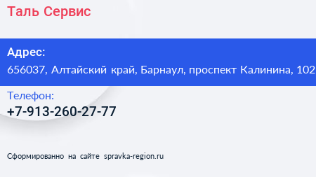 Таль-Сервис по адресу 656037, Алтайский край, Барнаул, проспект Калинина, 102 в дальнейшем Организация, размещена в следующих категориях: