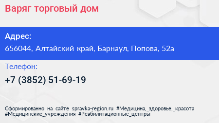 Варяг, торговый дом по адресу 656044, Алтайский край, Барнаул, Попова, 52а в дальнейшем Организация, размещена в следующих категориях:
