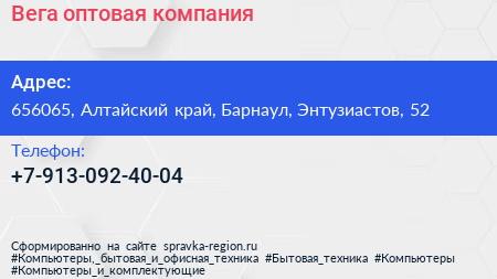 Вега, оптовая компания по адресу 656065, Алтайский край, Барнаул, Энтузиастов, 52 в дальнейшем Организация, размещена в следующих категориях: