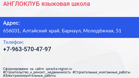 АНГЛОКЛУБ, языковая школа по адресу 656031, Алтайский край, Барнаул, Молодёжная, 51 в дальнейшем Организация, размещена в следующих категориях: