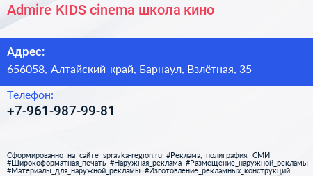 Admire KIDS cinema, школа кино по адресу 656058, Алтайский край, Барнаул, Взлётная, 35 в дальнейшем Организация, размещена в следующих категориях: