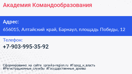 Академия Командообразования по адресу 656015, Алтайский край, Барнаул, площадь Победы, 12 в дальнейшем Организация, размещена в следующих категориях: