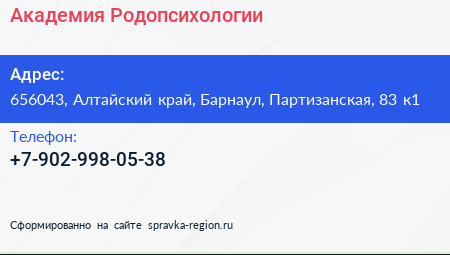 Академия Родопсихологии по адресу 656043, Алтайский край, Барнаул, Партизанская, 83 к1 в дальнейшем Организация, размещена в следующих категориях: