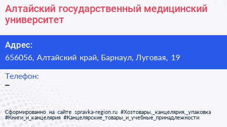 Алтайский государственный медицинский университет по адресу 656056, Алтайский край, Барнаул, Луговая, 19 в дальнейшем Организация, размещена в следующих категориях: