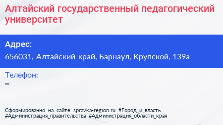 Алтайский государственный педагогический университет по адресу 656031, Алтайский край, Барнаул, Крупской, 139а в дальнейшем Организация, размещена в следующих категориях: