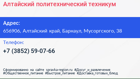 Алтайский политехнический техникум по адресу 656906, Алтайский край, Барнаул, Мусоргского, 38 в дальнейшем Организация, размещена в следующих категориях: