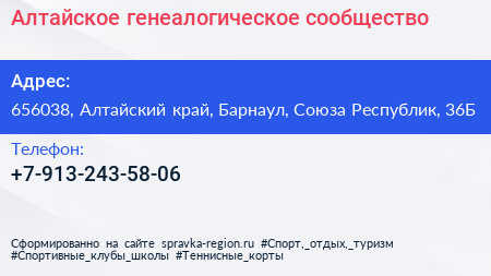 Алтайское генеалогическое сообщество по адресу 656038, Алтайский край, Барнаул, Союза Республик, 36Б в дальнейшем Организация, размещена в следующих категориях: