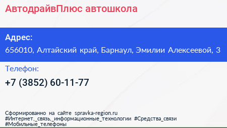 АвтодрайвПлюс, автошкола по адресу 656010, Алтайский край, Барнаул, Эмилии Алексеевой, 3 в дальнейшем Организация, размещена в следующих категориях: