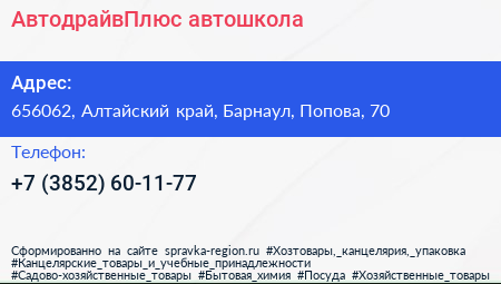 АвтодрайвПлюс, автошкола по адресу 656062, Алтайский край, Барнаул, Попова, 70 в дальнейшем Организация, размещена в следующих категориях:
