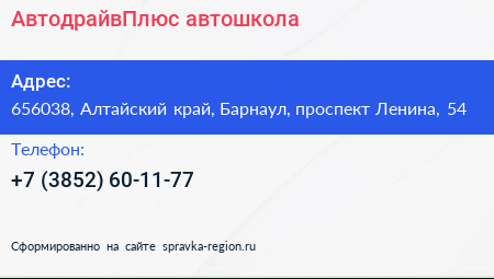 АвтодрайвПлюс, автошкола по адресу 656038, Алтайский край, Барнаул, проспект Ленина, 54 в дальнейшем Организация, размещена в следующих категориях: