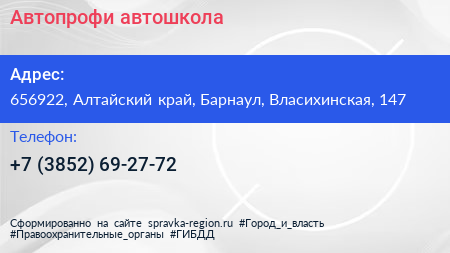 Автопрофи, автошкола по адресу 656922, Алтайский край, Барнаул, Власихинская, 147 в дальнейшем Организация, размещена в следующих категориях: