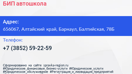 БИП, автошкола по адресу 656067, Алтайский край, Барнаул, Балтийская, 78Б в дальнейшем Организация, размещена в следующих категориях: