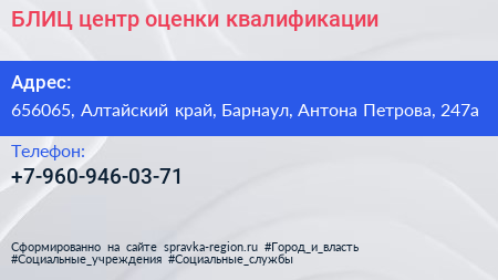 БЛИЦ, центр оценки квалификации по адресу 656065, Алтайский край, Барнаул, Антона Петрова, 247а в дальнейшем Организация, размещена в следующих категориях:
