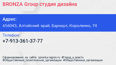 BRONZA Group, студия дизайна по адресу 656043, Алтайский край, Барнаул, Короленко, 74 в дальнейшем Организация, размещена в следующих категориях: