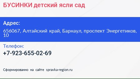 БУСИНКИ, детский ясли-сад по адресу 656067, Алтайский край, Барнаул, проспект Энергетиков, 10 в дальнейшем Организация, размещена в следующих категориях: