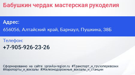 Бабушкин чердак, мастерская рукоделия по адресу 656056, Алтайский край, Барнаул, Пушкина, 38Б в дальнейшем Организация, размещена в следующих категориях: