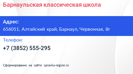 Барнаульская классическая школа по адресу 656011, Алтайский край, Барнаул, Червонная, 8г в дальнейшем Организация, размещена в следующих категориях: