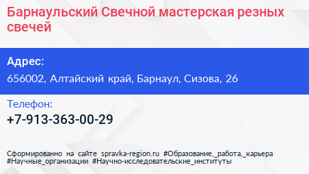 Барнаульский Свечной, мастерская резных свечей по адресу 656002, Алтайский край, Барнаул, Сизова, 26 в дальнейшем Организация, размещена в следующих категориях: