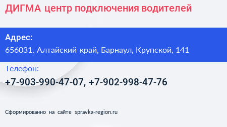 ДИГМА, центр подключения водителей по адресу 656031, Алтайский край, Барнаул, Крупской, 141 в дальнейшем Организация, размещена в следующих категориях: