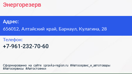 Энергорезерв по адресу 656012, Алтайский край, Барнаул, Кулагина, 28 в дальнейшем Организация, размещена в следующих категориях: