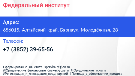 Федеральный институт по адресу 656015, Алтайский край, Барнаул, Молодёжная, 28 в дальнейшем Организация, размещена в следующих категориях: