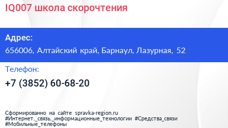 IQ007, школа скорочтения по адресу 656006, Алтайский край, Барнаул, Лазурная, 52 в дальнейшем Организация, размещена в следующих категориях: