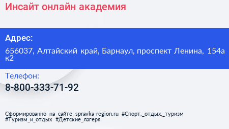 Инсайт, онлайн академия по адресу 656037, Алтайский край, Барнаул, проспект Ленина, 154а к2 в дальнейшем Организация, размещена в следующих категориях: