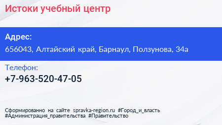 Истоки, учебный центр по адресу 656043, Алтайский край, Барнаул, Ползунова, 34а в дальнейшем Организация, размещена в следующих категориях:
