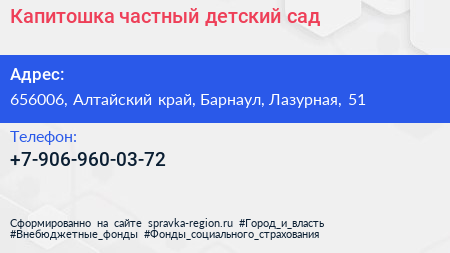 Капитошка, частный детский сад по адресу 656006, Алтайский край, Барнаул, Лазурная, 51 в дальнейшем Организация, размещена в следующих категориях: