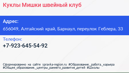 Куклы & Мишки, швейный клуб по адресу 656049, Алтайский край, Барнаул, переулок Геблера, 33 в дальнейшем Организация, размещена в следующих категориях: