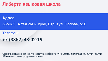 Либерти, языковая школа по адресу 656065, Алтайский край, Барнаул, Попова, 61Б в дальнейшем Организация, размещена в следующих категориях: