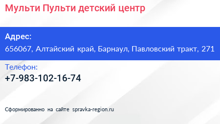 Мульти Пульти, детский центр по адресу 656067, Алтайский край, Барнаул, Павловский тракт, 271 в дальнейшем Организация, размещена в следующих категориях:
