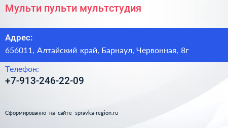 Мульти пульти, мультстудия по адресу 656011, Алтайский край, Барнаул, Червонная, 8г в дальнейшем Организация, размещена в следующих категориях: