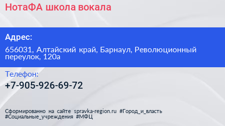 НотаФА, школа вокала по адресу 656031, Алтайский край, Барнаул, Революционный переулок, 120а в дальнейшем Организация, размещена в следующих категориях: