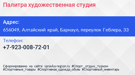 Палитра, художественная студия по адресу 656049, Алтайский край, Барнаул, переулок Геблера, 33 в дальнейшем Организация, размещена в следующих категориях: