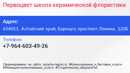 Первоцвет, школа керамической флористики по адресу 656011, Алтайский край, Барнаул, проспект Ленина, 120Б в дальнейшем Организация, размещена в следующих категориях: