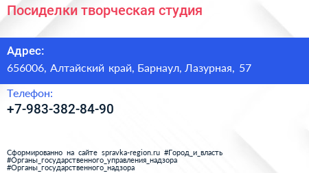 Посиделки, творческая студия по адресу 656006, Алтайский край, Барнаул, Лазурная, 57 в дальнейшем Организация, размещена в следующих категориях: