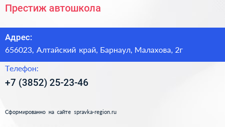 Престиж, автошкола по адресу 656023, Алтайский край, Барнаул, Малахова, 2г в дальнейшем Организация, размещена в следующих категориях: