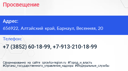 Просвещение по адресу 656922, Алтайский край, Барнаул, Весенняя, 20 в дальнейшем Организация, размещена в следующих категориях: