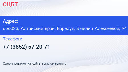 СЦБТ по адресу 656023, Алтайский край, Барнаул, Эмилии Алексеевой, 94 в дальнейшем Организация, размещена в следующих категориях: