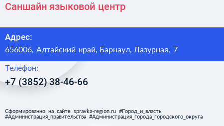 Саншайн, языковой центр по адресу 656006, Алтайский край, Барнаул, Лазурная, 7 в дальнейшем Организация, размещена в следующих категориях: