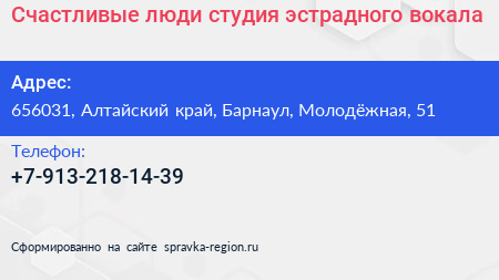 Счастливые люди, студия эстрадного вокала по адресу 656031, Алтайский край, Барнаул, Молодёжная, 51 в дальнейшем Организация, размещена в следующих категориях: