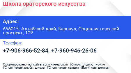 Школа ораторского искусства по адресу 656015, Алтайский край, Барнаул, Социалистический проспект, 109 в дальнейшем Организация, размещена в следующих категориях:
