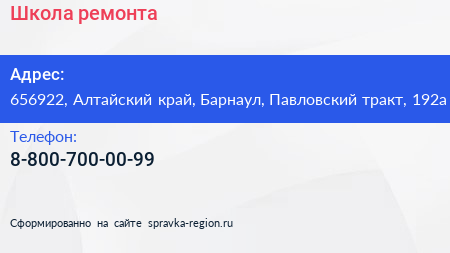 Школа ремонта по адресу 656922, Алтайский край, Барнаул, Павловский тракт, 192а в дальнейшем Организация, размещена в следующих категориях: