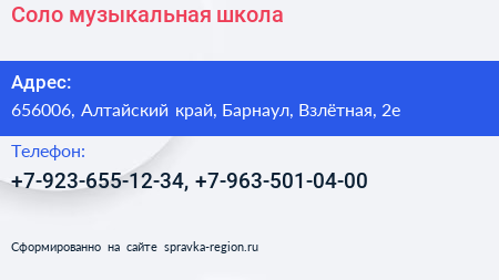 Соло, музыкальная школа по адресу 656006, Алтайский край, Барнаул, Взлётная, 2е в дальнейшем Организация, размещена в следующих категориях: