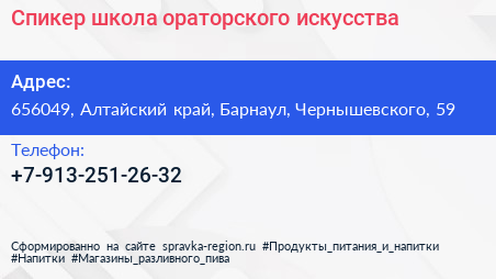 Спикер, школа ораторского искусства по адресу 656049, Алтайский край, Барнаул, Чернышевского, 59 в дальнейшем Организация, размещена в следующих категориях: