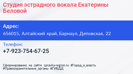 Студия эстрадного вокала Екатерины Беловой по адресу 656015, Алтайский край, Барнаул, Деповская, 22 в дальнейшем Организация, размещена в следующих категориях: