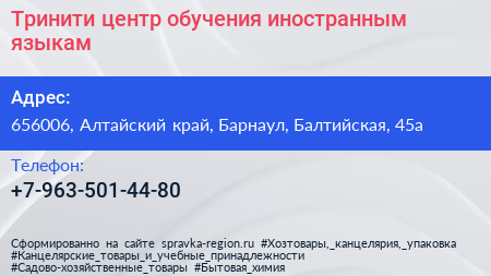 Тринити, центр обучения иностранным языкам по адресу 656006, Алтайский край, Барнаул, Балтийская, 45а в дальнейшем Организация, размещена в следующих категориях: